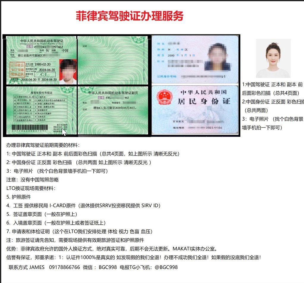 如果您手上有中国驾驶证 需要做另外一个国家的大使馆认证可以联系我们,做其他国家还是菲律宾驾驶证的公正认证都可以服务 有需要可联系欢迎咨询我们了解更多,微信BGC998 电报小飞机 @BGC998 电话/VIBER/WHAT'S APP+63-912-0912-222 优先咨询电报 WHAT'S APP 免验证直接咨询,添加请主动告知咨询事宜 谢谢。