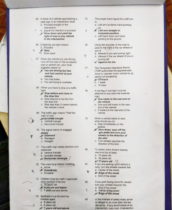在菲律宾生活不得不申请一本菲律宾驾照,不然就非常的不方便,有车不能开,那么申在菲律宾考驾照要去哪个部门呢?998visa来给大家解答,并且附上考试答卷部分答案图片。 需要考试协助 换证安全教育考试等需求可以联系我们。菲律宾驾照考试难度高吗?考试可以替考吗?