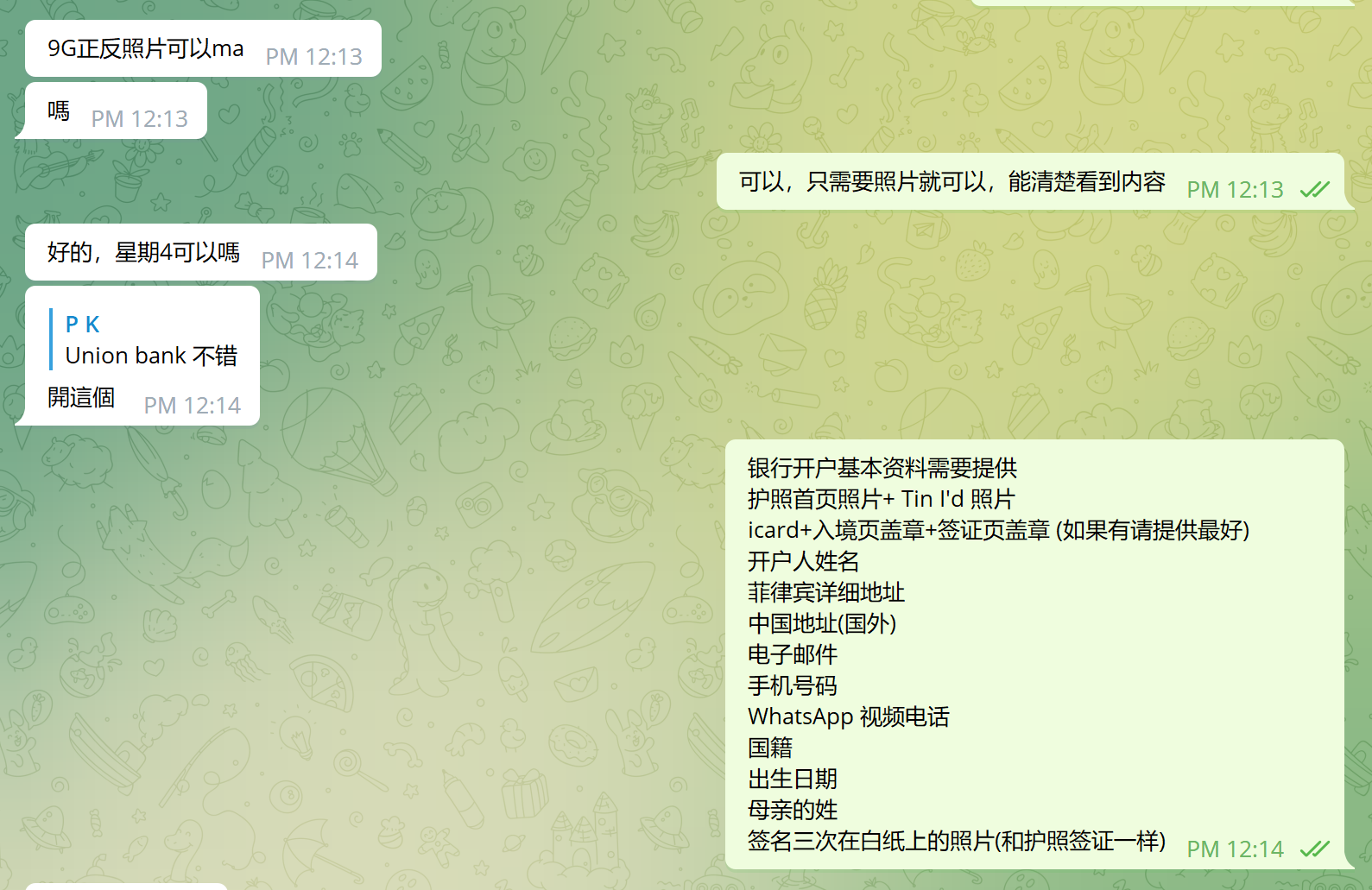 银行开户基本资料需要提供护照首页照片+ Tin I'd 照片icard+入境页盖章+签证页盖章 (如果有请提供最好)开户人姓名 菲律宾详细地址 中国地址(国外) 电子邮件手机号码 WhatsApp 视频电话国籍出生日期 母亲的姓签名三次在白纸上的照片(和护照签证一样)