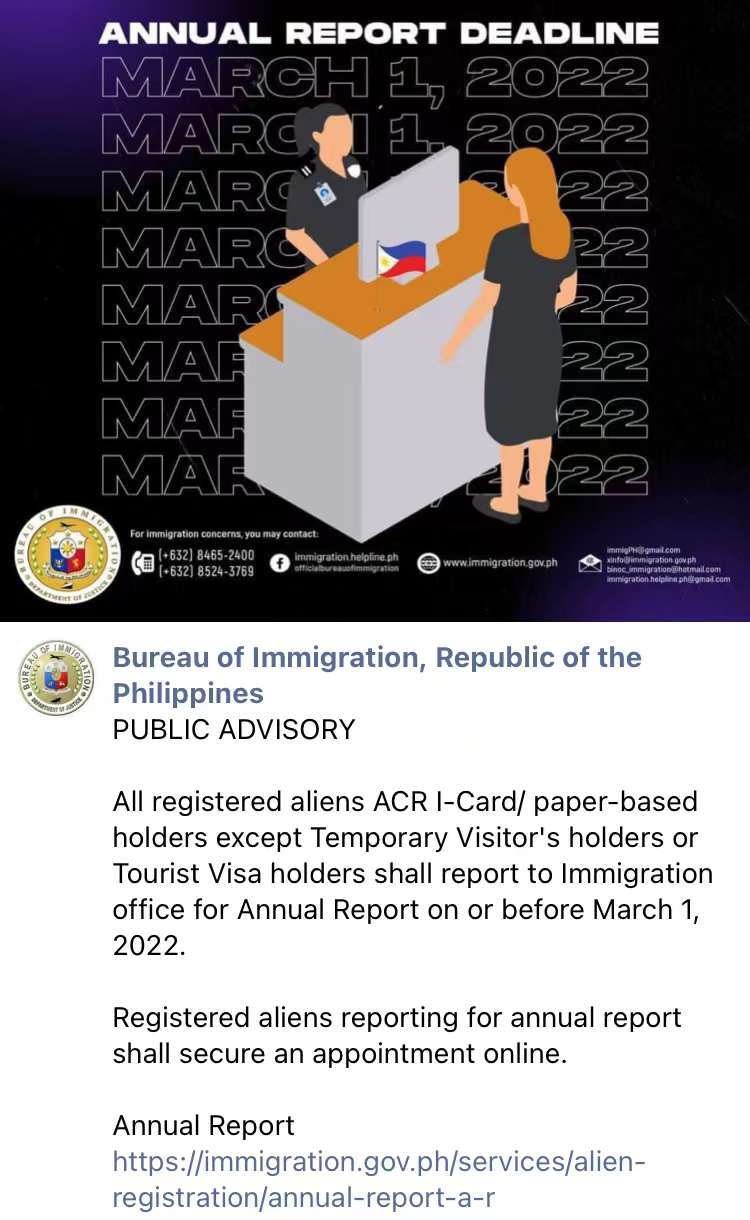 菲律宾移民局提醒2022年常年报道annual report最后截止日期是3月1号