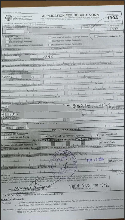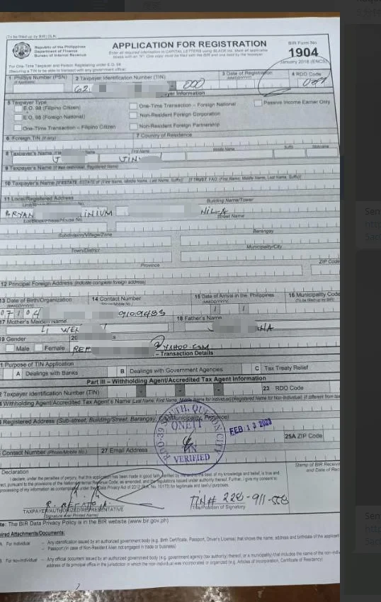 近期又有不少客人咨询菲律宾税号办理的事情,这里给大家介绍下菲律宾税卡的一些事情,菲律宾税卡TIN 是菲律宾税务局签发的税务登记识别号码,此号码有短期一次性质的 有长期性质的,有临时性质的,具体看你使用和用途来 看,办理税卡需要的材料我们也将进一步讲解,菲律宾税务登记识别号 国际版本办理 客人境外可用办理需要材料,提供 电子资料即可Passport Biopage 护照首页Name of Mother 母亲姓名Name of Father 父亲姓名Status 婚姻状态address in the Philippines 在菲律宾住址(如果没有请告知我们安排)Foreign address 国外住址Company name 公司名字Company Address 公司地址