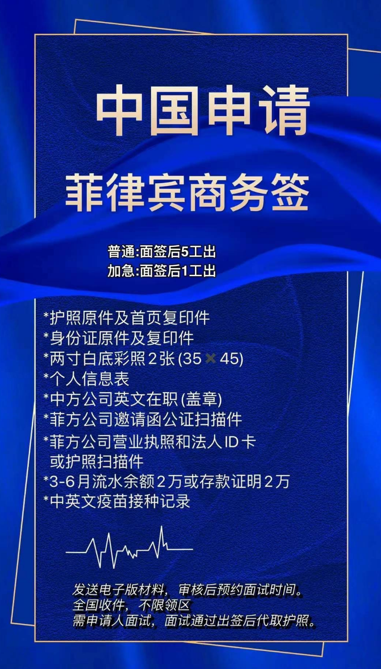 中国申请菲律宾商务签普通:面签后5工出加急:面签后1工出护照原件及首页复印件身份证原件及复印件两寸白底彩照2张(35 * 45)个人信息表中方公司英文在职(盖章)菲方公司邀请函公证扫描件菲方公司营业执照和法人ID卡或护照扫描件3-6月流水余额2万或存款证明2万*中英文疫苗接种记录发送电子版材料,审核后预约面试时间。全国收件,不限领区需申请人面试,面试通过出签后代取护照。