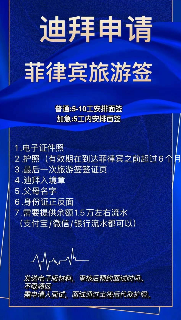 迪拜申请菲律宾旅游签普通:5-10工安排面签加急:5工内安排面签1.电子证件照2.护照 (有效期在到达菲律宾之前超过6个月)3.最后一次旅游签签证页4.迪拜入境章5.父母名字6.身份证正反面7.需要提供余额1.5万左右流水(支付宝/微信/银行流水都可以)发送电子版材料,审核后预约面试时间不限领区需申请人面试,面试通过出签后代取护照
