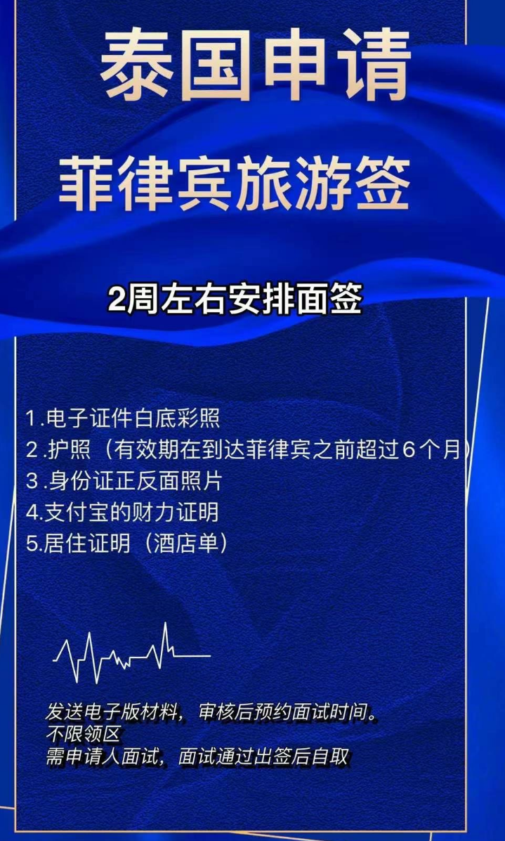 泰国申请菲律宾旅游签2周左右安排面签1.电子证件白底彩照2.护照 (有效期在到达菲律宾之前超过6个月3.身份证正反面照片4.支付宝的财力证明5.居住证明 (酒店单发送电子版材料,审核后预约面试时间。不限领区需申请人面试,面试通过出签后自取