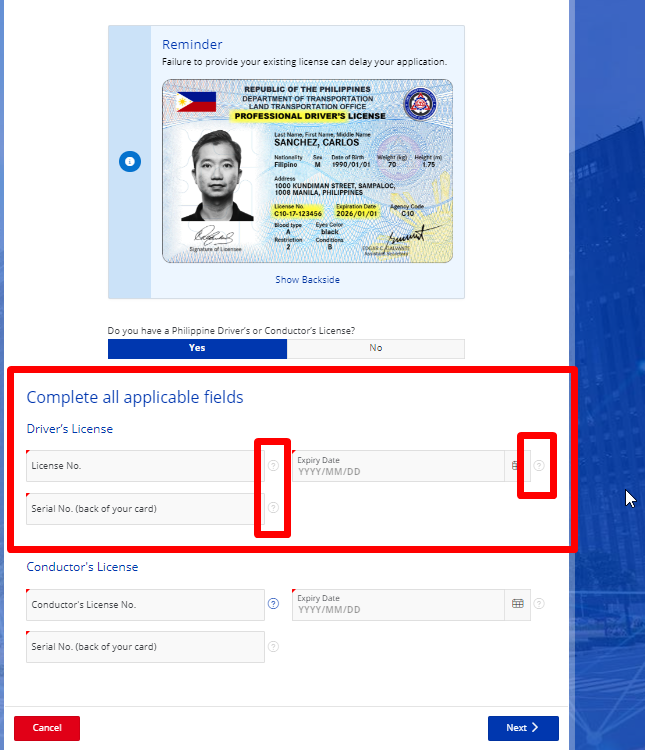 下一步要填写过期日期 驾驶证号码等 不清楚的可以点击那个? 问号 会有提醒。。。;。
