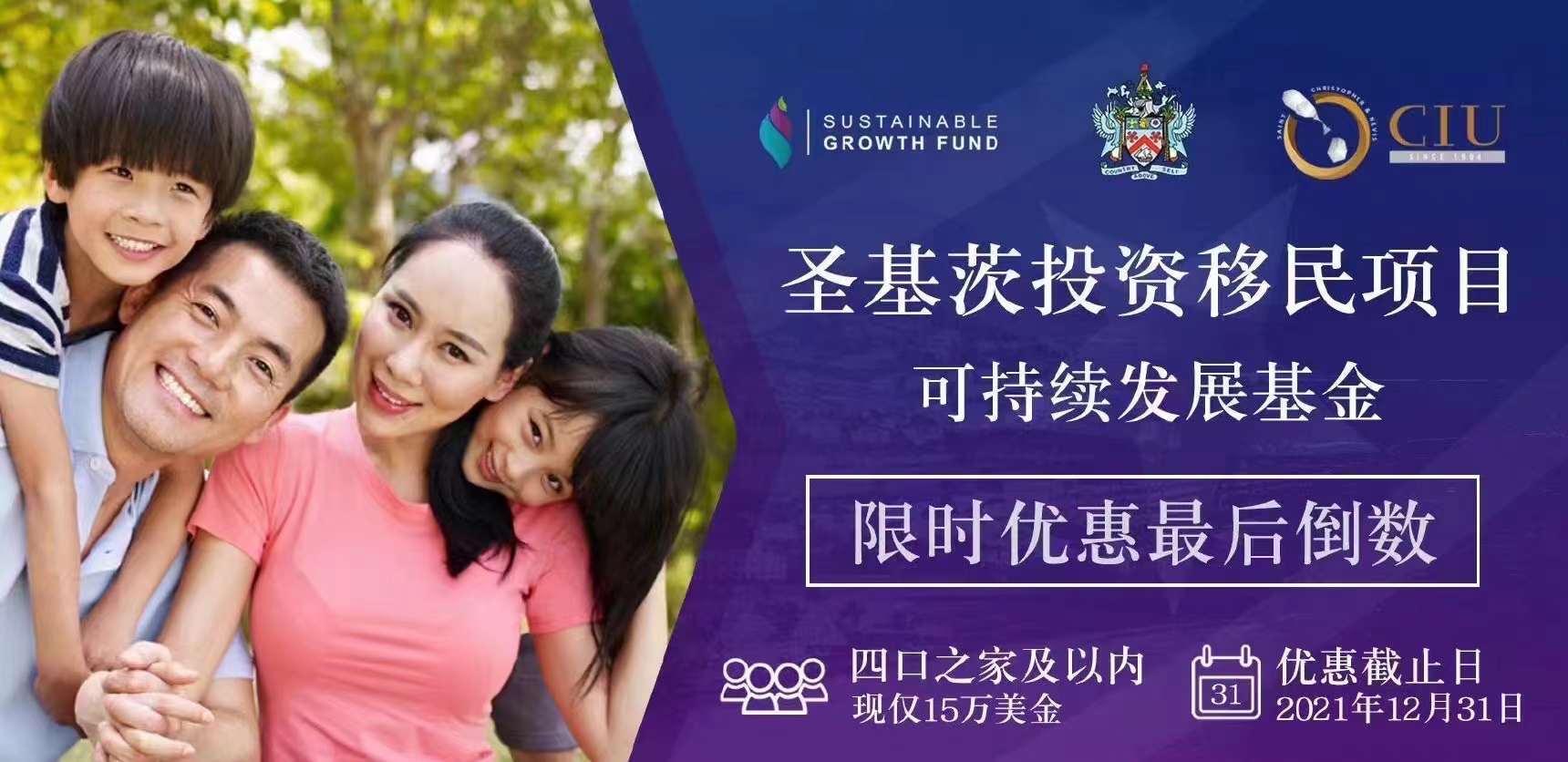 圣基茨和尼维斯被称为行业的“铂金标准”,是同类项目中高效、透明且值得信赖的投资选择之一。可持续发展基金(SGF)是获得圣基茨和尼维斯公民身份的最快途径,也是唯一提供优惠的选择。目前,申请圣基茨和尼维斯可持续发展基金的家庭投资者,可享受限时特价,原投资额19.5万美金,现四口之家仅需15万美金便可全家获取公民身份,与单人申请价格相同。该优惠将于2021年12月31日截止。