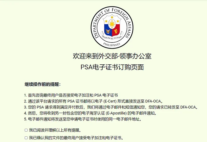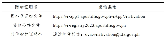 附加证明书和电子附加证明书的相关信息均可在https://www.apostille.gov.ph查询。