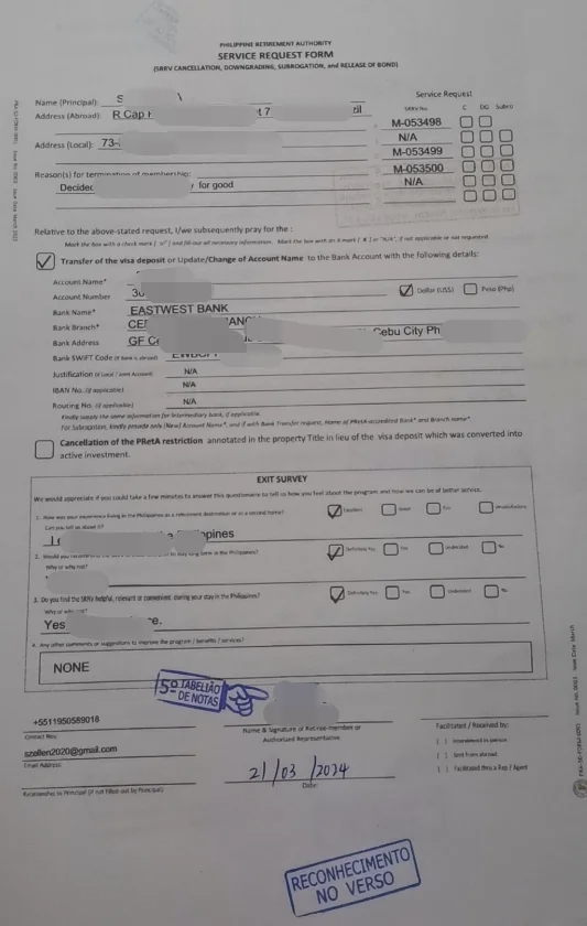 1. Accomplished Exit Inteview Forms填写退会申请表 2. Letter Request Stating the reason for the cancellation of SSRV and Bank instruction提供 退会陈述 和原始银行汇款单据3. PRA ID Card (of each member)所有成员 srrv ID 身份证原件4. Notarized Affidavit of Quitclaim菲律宾本地 律师认证申请文件5. Original old Passports where the SSRV Visa is/are stamped and renewl one (of eash member) 所有会员原始申请护照原件(申请时候的护照和最新护照如果换了的话)6. Original new Passports如果成员申请新的护照,也需要提供新护照原件。7. Emmigration Exit Clearance (ECC) 所有成员 离境前办理移民局ecc清关清单 8.如果成员不能前往菲律宾受理 需要做 授权代办证书并且经过当地公证和海牙认证。(格式我们提供 认证自备。可以入境的话入境需要等待大概12-15工左右。