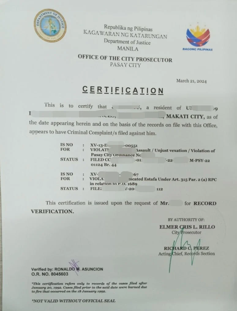 在菲律宾办理业务经常要求提供无犯罪证明,但是在办理无犯罪证明有一个诡异的现场就是十有八九容易重名,和有案底的人重名,这种情况就需要去各个部门开你和对方不是同人的证明,开具相关证明如果没有经验绝对是一件耗时的事情,去三五次都摸不清楚头绪,针对这个问题我们有帮忙处理重名问题需要解除的文件,有需要的小伙伴欢迎咨询。微信BGC998 电报 @BGC998
