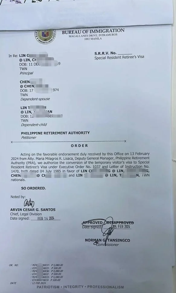 Srrv 退休移民 的资料/条件需要如下(1)主申请人(户主)年龄要求50周岁以上;(2)海外汇款2万美金到菲律宾政府账号定存,这个款项可以支持最多一家三口同时申办(孩子需要21岁以下);若超出3人申请后多加一名依亲眷属,加15000美金/每人 存款。(3)SRRV签证持有期间存款不可提取,取消身份可以申请取回全部存款,如果计划购买房产需要汇款5万美金才能取出去购买。(4)申请表格,可以向我们索取文件填写,或者提供信息我们填写制作合规申请标准表格。(5)提供电子照片,我们制作政府要求尺寸的照片。2CMX2CM 15张菲律宾退休移民申请费用:主申请人申请费用:USD$1,400 眷属申请费用:USD$300/人 年费:USD$360/年 (一家三口费用; 如果超出三人 每多一人费用需增加 USD$100) 体检费 :500人民币每人菲律宾指定体检中心做政府加急费用: 25000菲律宾比索 每人 (大约=3300人民币) 加急费看客人需要确认是否加急,正常是建议加急,加急的话存款到达且开出存款证明后,人入境菲律宾后提交 申请后 约10-12工作日左右做完。没有加急大约3个月左右做完(适合已经移居菲律宾了的申请 。