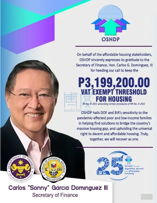 大意:菲律宾社会化和经济住房开发商组织 (OSHDP) 代表经济适用房的利益相关者,向财政部长阁下表示衷心感谢。 部长阁下响应我们的呼吁,将住房的增值税免税门槛保持在 3,199,200.00比索。引用大流行的不利影响和迫切需要解决贫困和低收入菲律宾人的困境,OSHDP 与全国房地产协会联合,写信给部长,并呼吁实施正确的政策。 感谢财政部和税务局,对受疫情大流行影响的贫困和低收入工人的高度敏感反应,帮助寻找解决方案以弥合该国巨大的住房缺口,并维护菲律宾家庭获得体面和负担得起的住房的普遍权利。